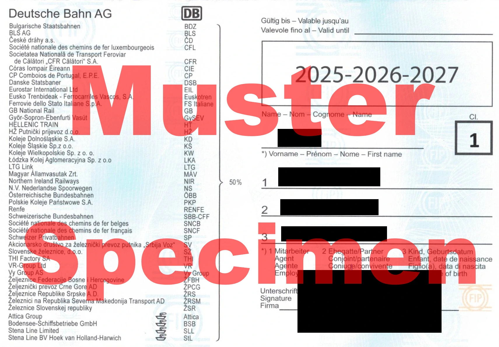 The validity period of the FIP Card depends on your railway company. The FIP Card is valid starting one month before the printed first year of validity (from December 1st of the previous year) and up to one month after the last year of validity (until January 31th of the following year).